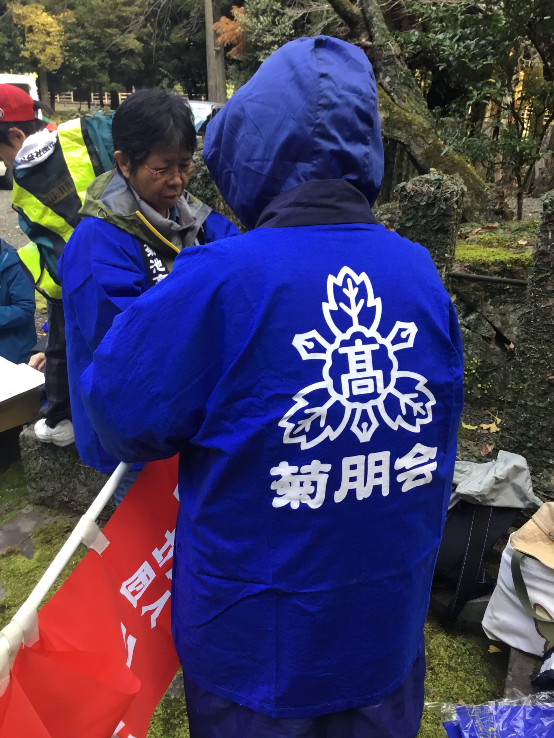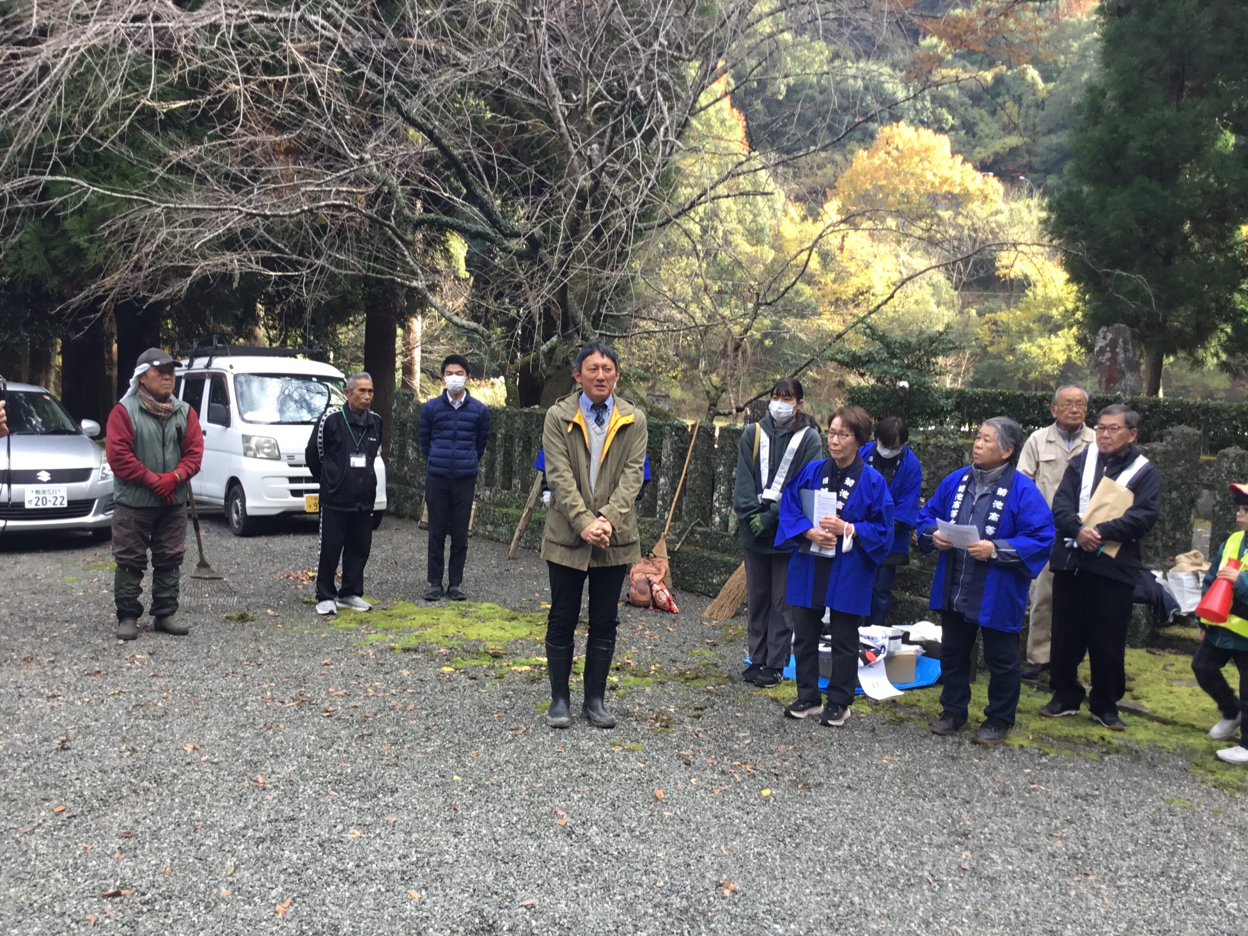 静寂に包まれ、宮内庁管轄御陵は厳かで身が引き締まる雰囲気で代々墓守の松岡さんのお話では総面積2,500坪で通常は立ち入りが許されていない場所であり、今回は特別に円墳までも開放していただき、苔むした園内の落ち葉や枯れ木を取り除き、綺麗になりました。