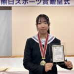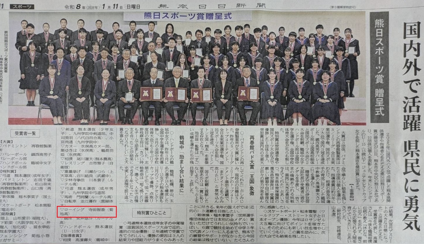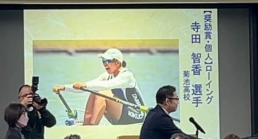 この賞は2025年に国内外で活躍した選手や指導者を讃えるもので、菊池高校2年の寺田智香さんは昨年の全国高校総体(インターハイ)女子シングルスカルなどでの優勝が評価され、受賞となりました。